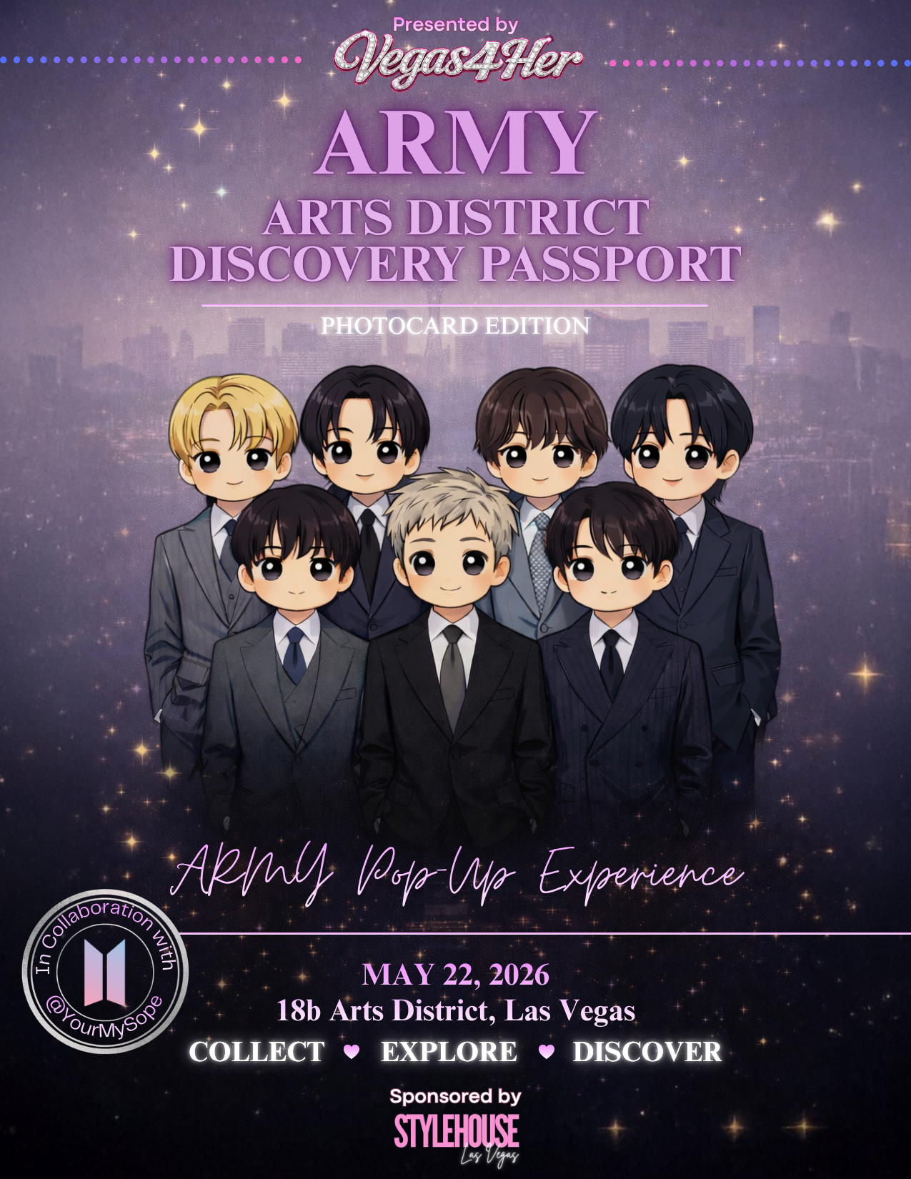 Pick up your ARMY Arts District Discovery Passport: Photocard Edition at the BTS ARMY inspired Pop-Up 🎉. This is your official pass to explore, collect, and play.